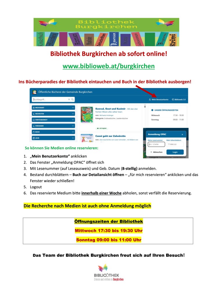 20/04/202620/04/2026 Herta Masarié Reservieren von Medien Das reservieren von Medien in unserer Bibliothek im neuen Gesicht: https://www.biblioweb.at/burgkirchen Gefällt mir Wird geladen … Ähnliche Beiträge